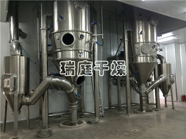 閉路式沸騰干燥機(jī)由空氣過濾器,空氣加熱器,干燥床,制粒噴槍、分離室,過濾室,排風(fēng)管、引風(fēng)機(jī)、煙囪、控制系統(tǒng)等組成。